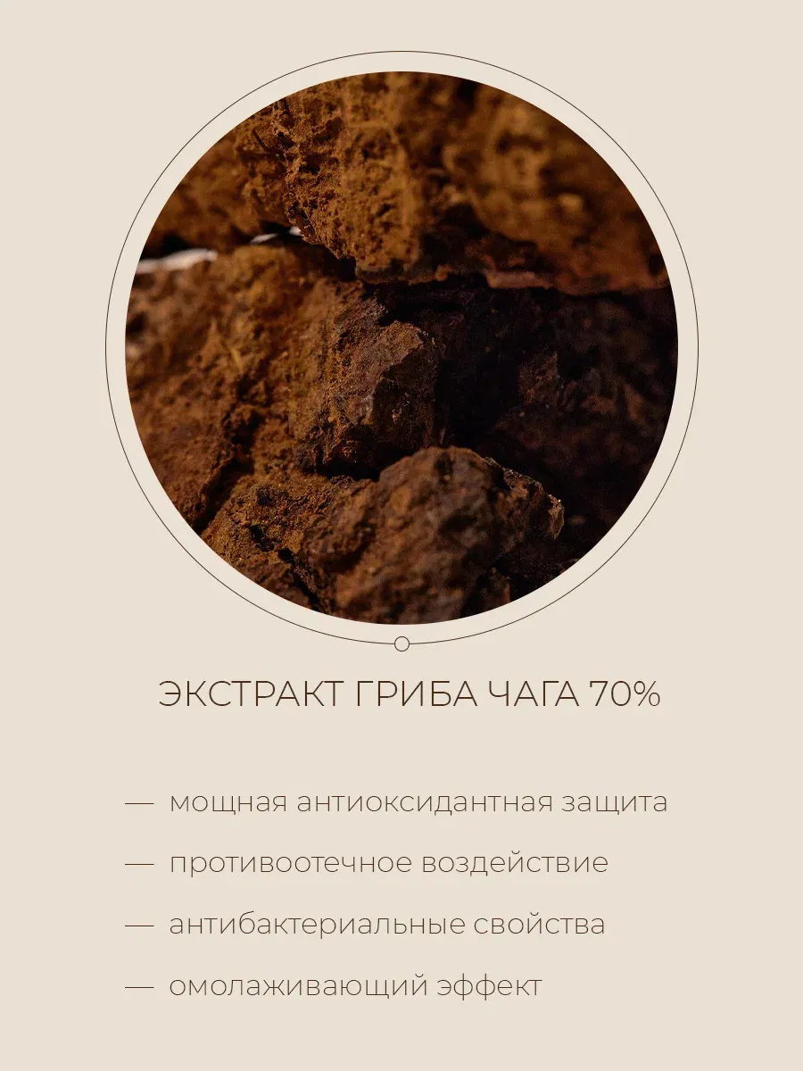Экстракт гриба чага 70% — обладает мощными антиоксидантными свойствами, подавляет развитие бактерий и защищает от вредного действия факторов внешней среды, тонизирует и омолаживает, помогает в борьбе с отеками.