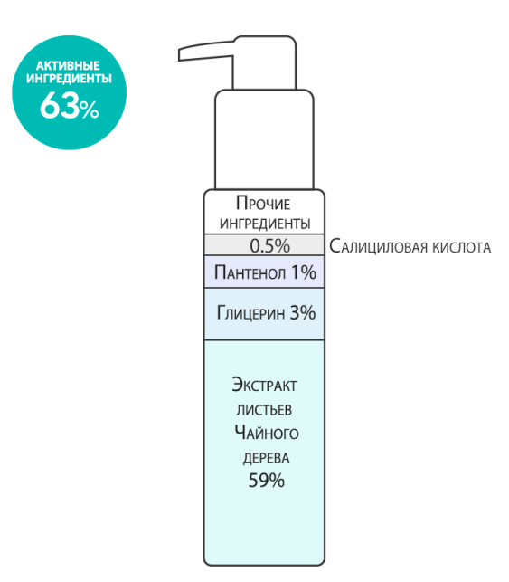 Состав: Melaleuca Alternifolia (Tea Tree) Leaf Oil (59.2%), Purified water (17.5%), Disodium Cocoamphodiacetate (5.1%), Glycerin (3.0%), Sodium C14-16 Olefinsulfonate (2.8%), 1,2-Hexanediol (2.2%), Coco-Glucoside (2.2%), Lauryl Glucoside (2.0%), Sodium Chloride (1.8%), Panthenol (1.0%), Sodium Methyl Cocoyl Taurate, Acrylate/C10-30 Alkyl Acrylate Crosspolymer, Salicylic Acid, Hexylene Glycol, Tea Tree Leaf Oil, Ethylhexylglycerin, Hexadecene, Tetradecene, Xanthan Gum, Sodium Sulfate, Saccharide Isomerate, Sodium Citrate, Citric Acid