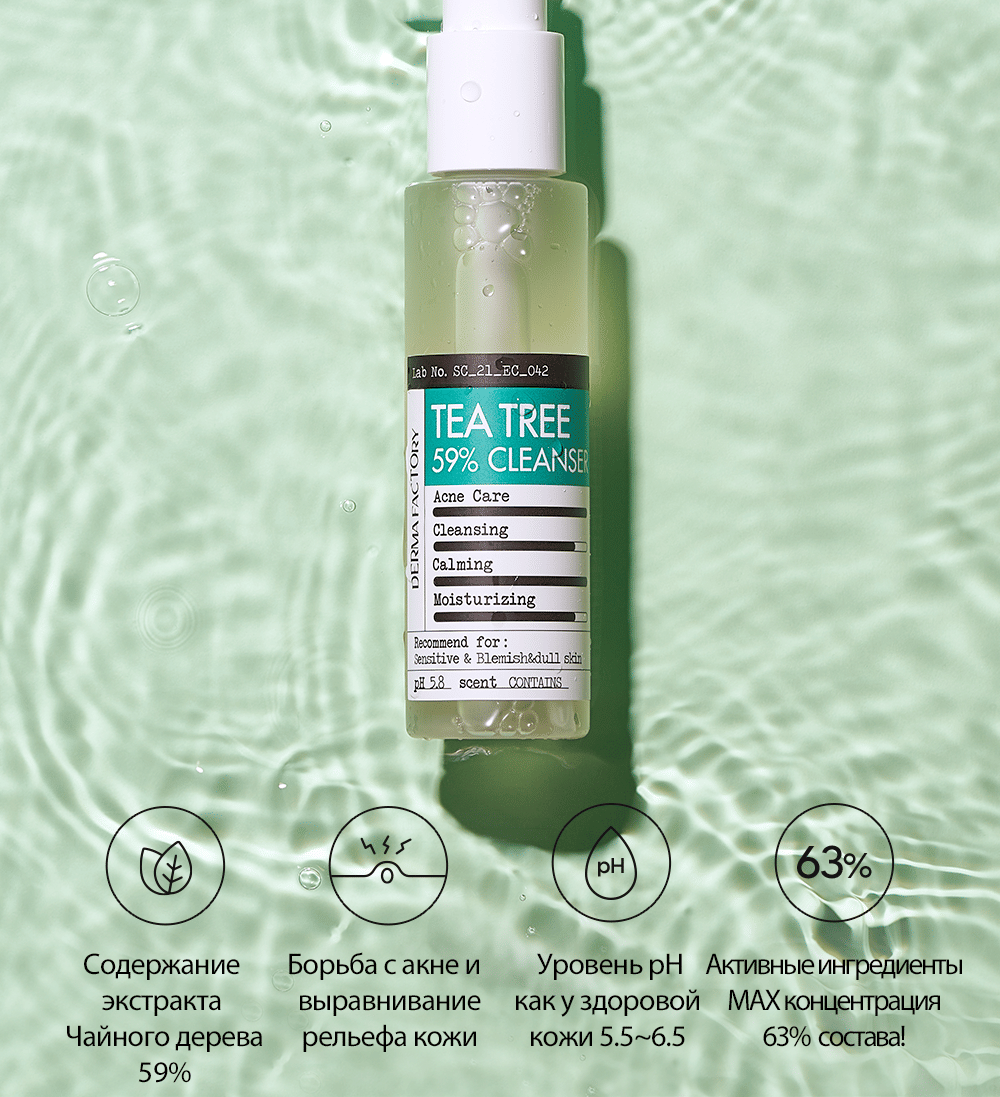 Гель Tea Tree 59% Gel Cleanser тщательно удаляет загрязнения из пор и очищает поверхность кожи, препятствует появлению воспалений и чёрных точек, не вызывает чувства стянутости после умывания. Уровень pH 5.8.