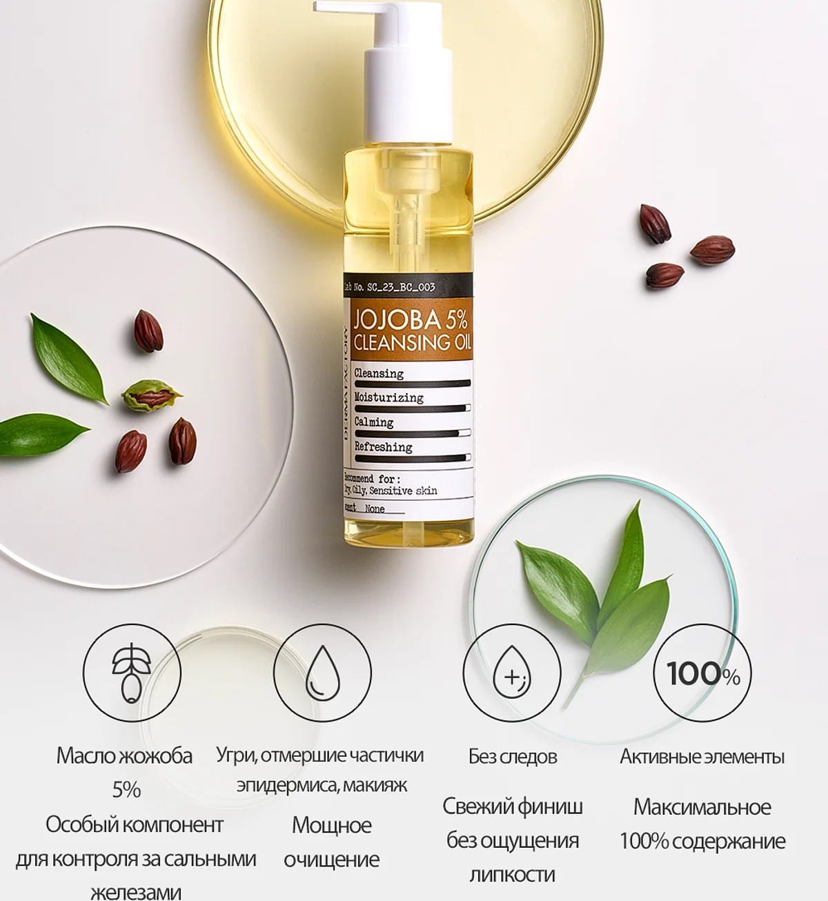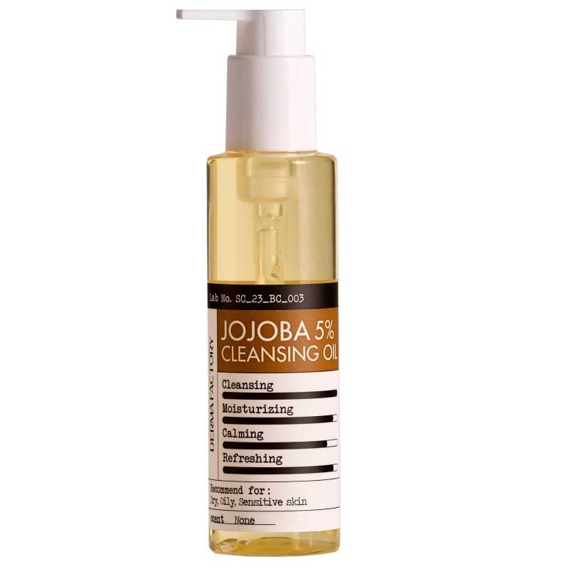 Мягкое очищающее масло с жожоба Derma Factory Jojoba 5 Cleansing Oil глубоко очищает кожу от излишков себума, загрязнений, декоративной косметики и SPF. Способствует сохранению барьерной функции кожи, предотвращая потерю влаги в процессе очищения. Смягчает кожу, помогает снять покраснения и предотвратить раздражения.
