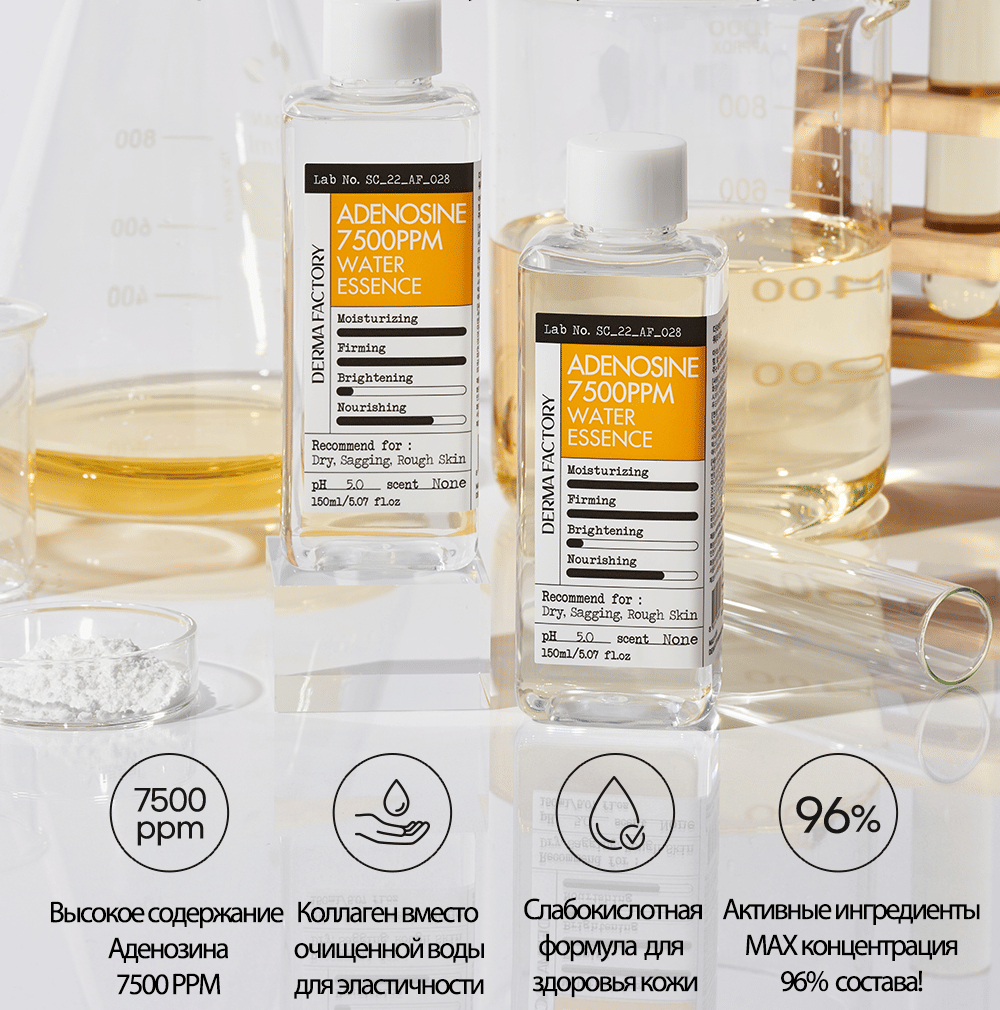 Тонер-эссенция Adenosine 7500ppm Water Essence моментально освежает и увлажняет при нанесении, разглаживает и уплотняет кожу, поддерживает эластичность и упругость. Уровень pH 5.0±1.