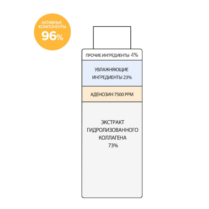 Состав: Hydrolyzed Collagen (73%), Glycerin (20%), Butylene Glycol (2.3%), 1,2-Hexanediol (1.9%), Isoniacinamide (1.2%), Adenosine (7500ppm), Cyclodextrin, Hydroxypropyl Cyclodextrin, Citric Acid, Xanthan Gum, Disodium EDIT, Ethylhexylglycerin, Purified water