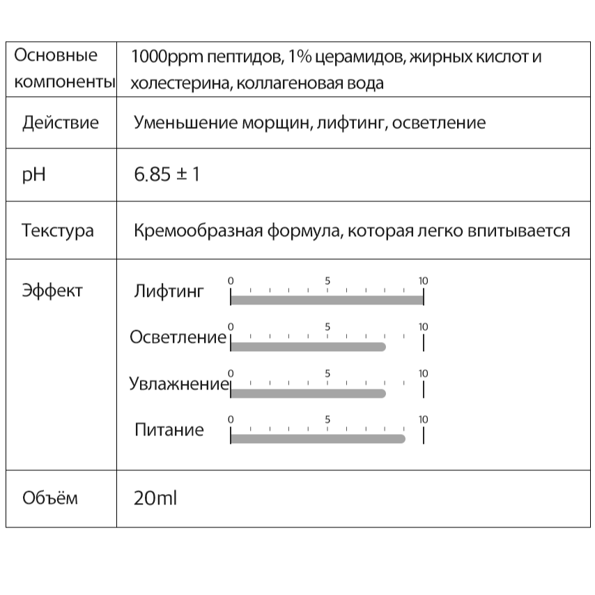 Пептиды оказывают антивозрастное действие, сокращают глубину морщин, разглаживают и подтягивают, стимулируют регенерацию.