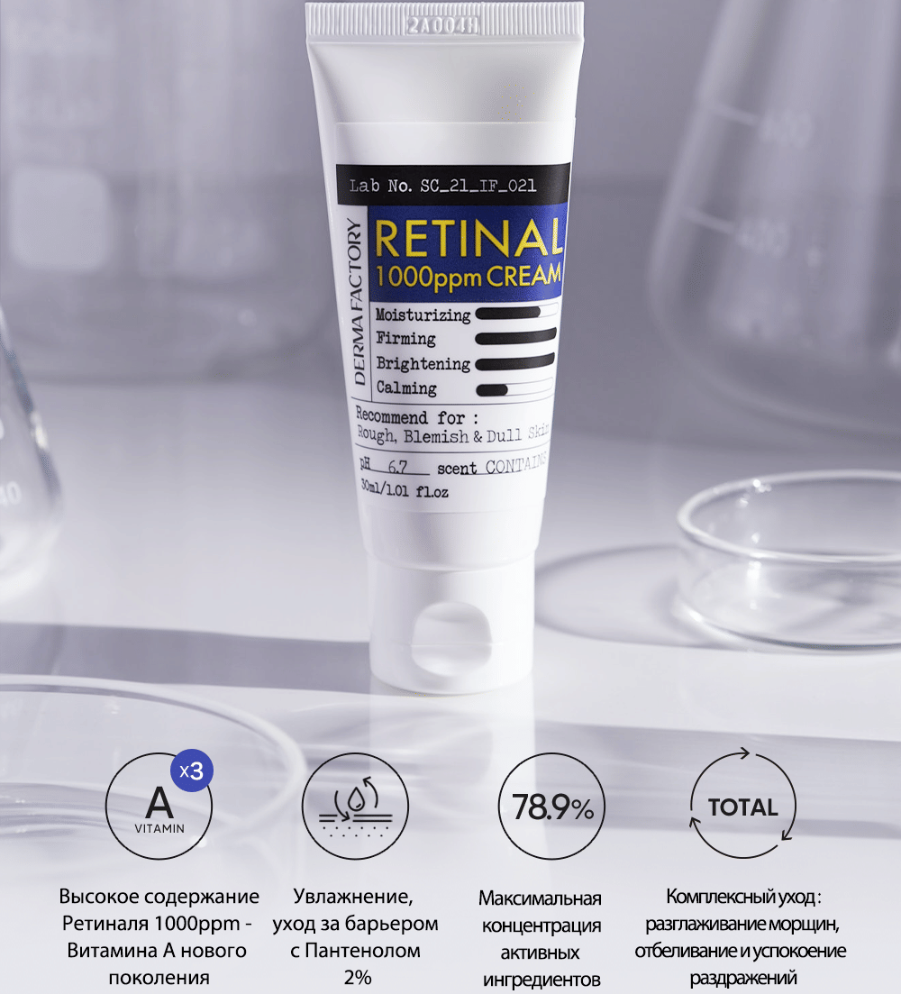 Формула содержит ретиналь (1000 ppm) — одну из самых эффективных форм витамина A, доступных в косметике. Ретиналь стимулирует клеточное обновление, за счёт чего разглаживает текстуру кожи, уменьшает видимость морщин и расширенных пор, повышает синтез собственного коллагена и гиалуроновой кислоты.