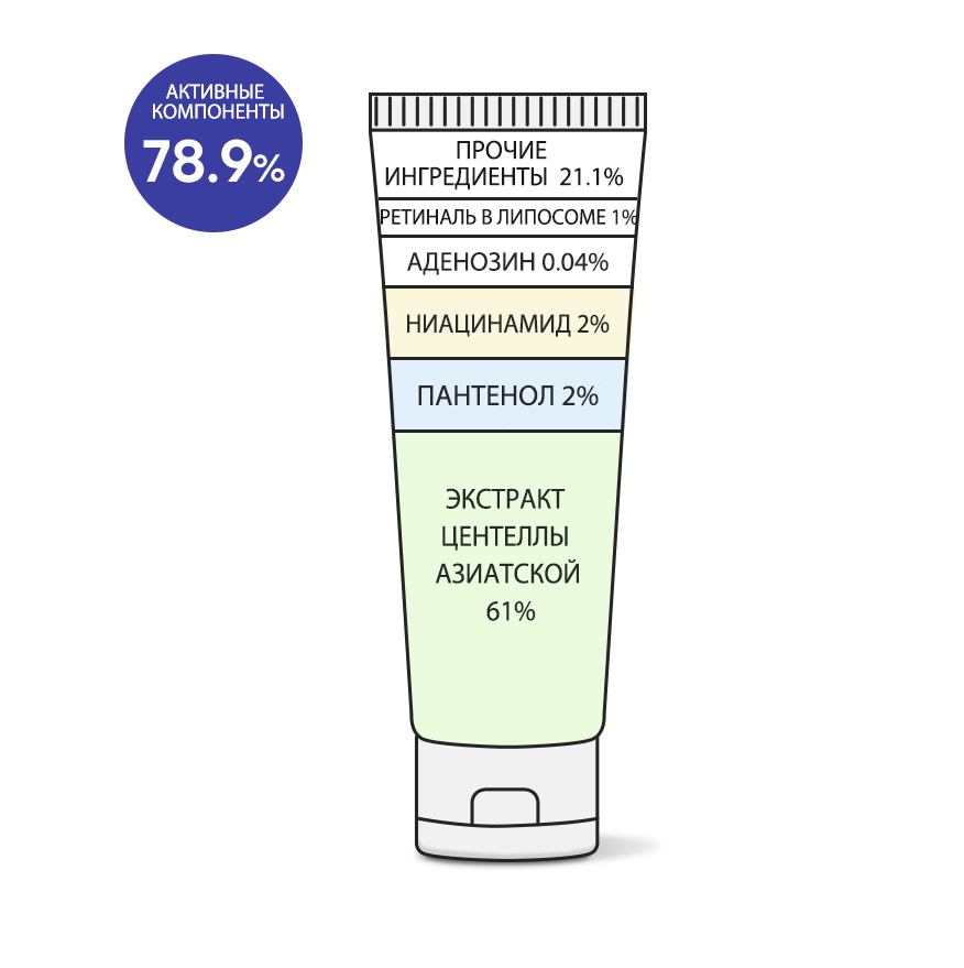 Состав: Centella Asiatica Extract (61.3%), Glycerin (13.5%), Purified water (5.2%), Hydrogenated Polydecene (5.0%), Caprylyl Methicone (3.0%), Niacinamide (2.0%), Panthenol (2.0%), Pentylene Glycol (2.0%), 1,2-Hexanediol (1.6%), Caprylic/Capric Triglycerides (1.2%), Ascorbic Acid, White Rice Flower Extract, Butylene Glycol, Retinal, Lecithin, Polymethylsilsesquioxane, Ammonium Acryloyldimethyl Taurate/Vp copolymer, Acrylate/C10-30 Alkyl Acrylate Crosspolymer, Hydroxyethyl Acrylate/Sodium Acryloyldimethyl Taurate Copolymer, Tromethamine, Xanthan Gum, Adenosine, T-Butyl Alcohol, Sorbitan Isostearate, Ethylhexylglycerin, Disodium EDIT, Perfume
