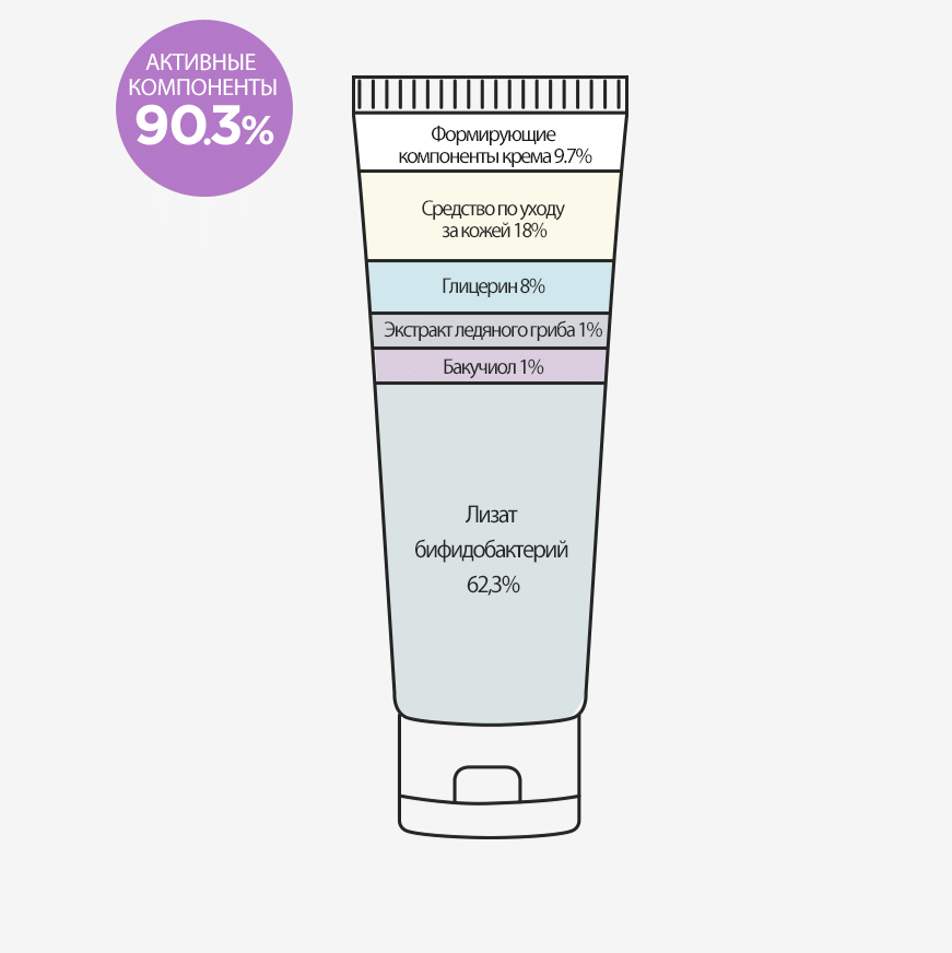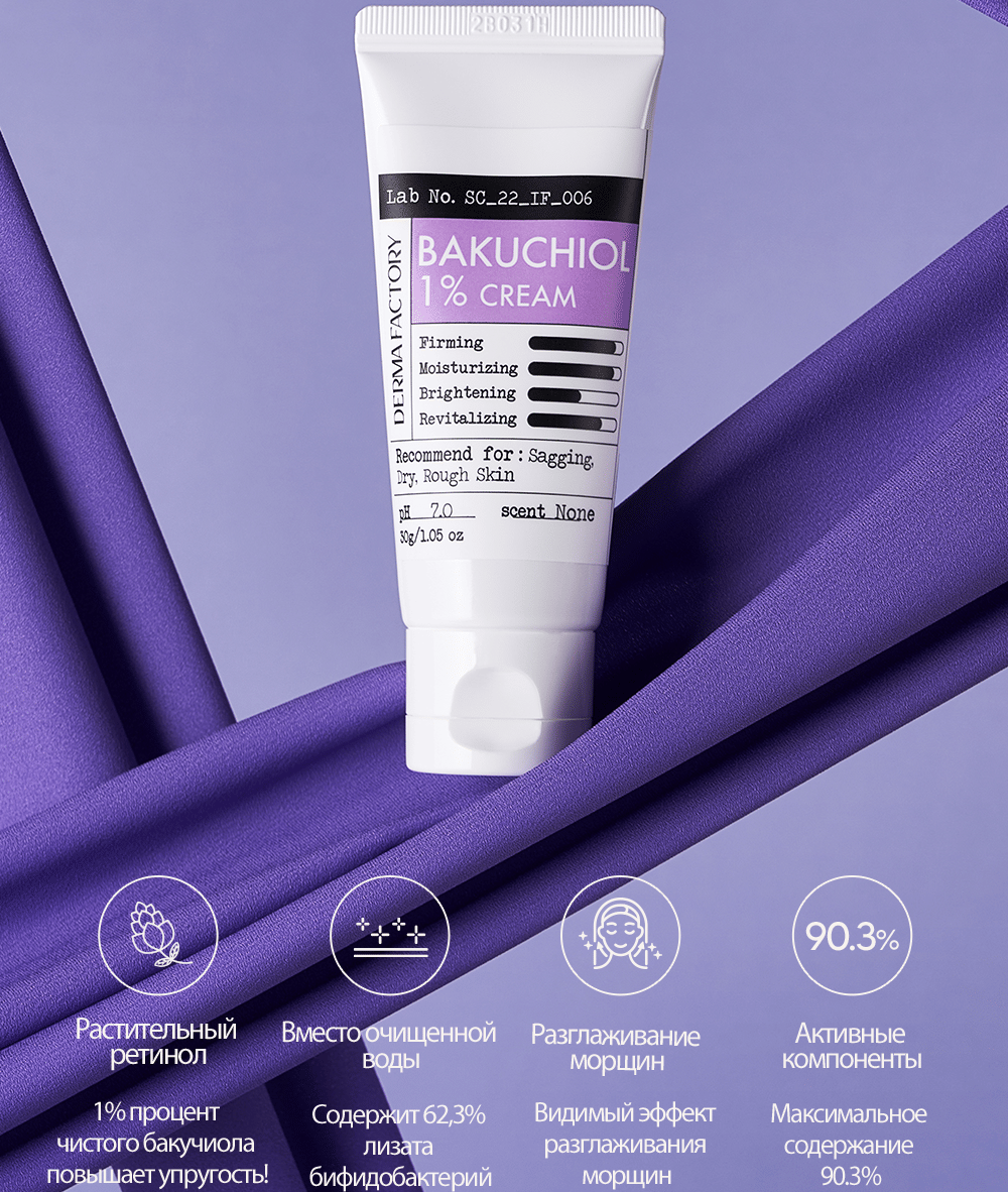 Насыщенный крем с содержанием 1% бакучиола и 62% лизата бифидобактерий уменьшает пигментацию, борется с акне, повышает упругость кожи и эффективно борется с морщинами за счёт растительного ретинола. Формула сбалансирована увлажняющими и питательными ингредиентами.