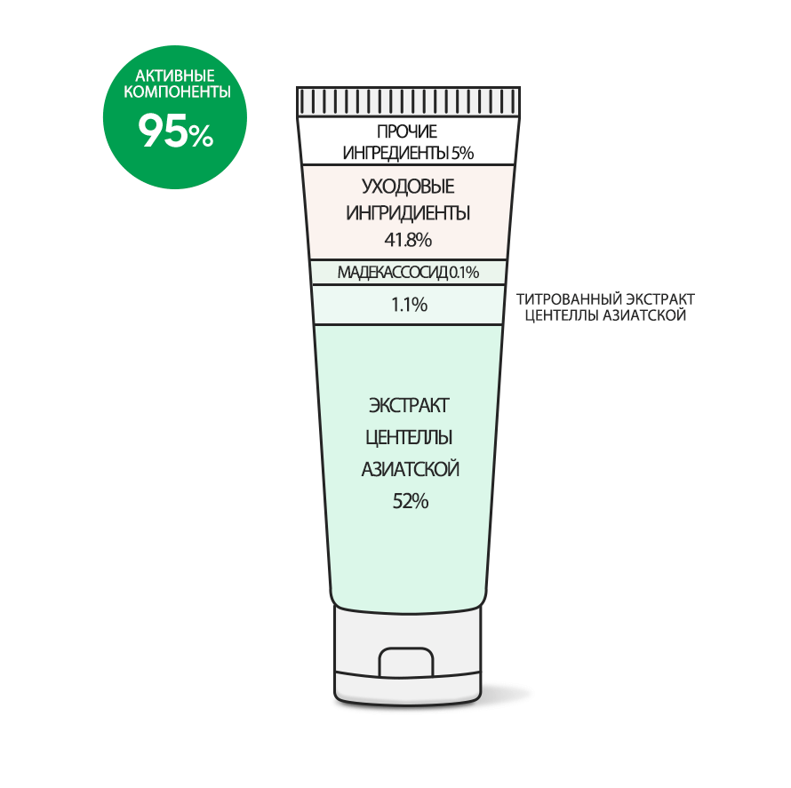 Основным компонентом формулы является экстракт центеллы азиатской — успокаивающий актив, который снимает покраснение, устраняет отёки, уменьшает видимость сосудистой звёздочки и помогает бороться с куперозом, а также снижает чувствительность.