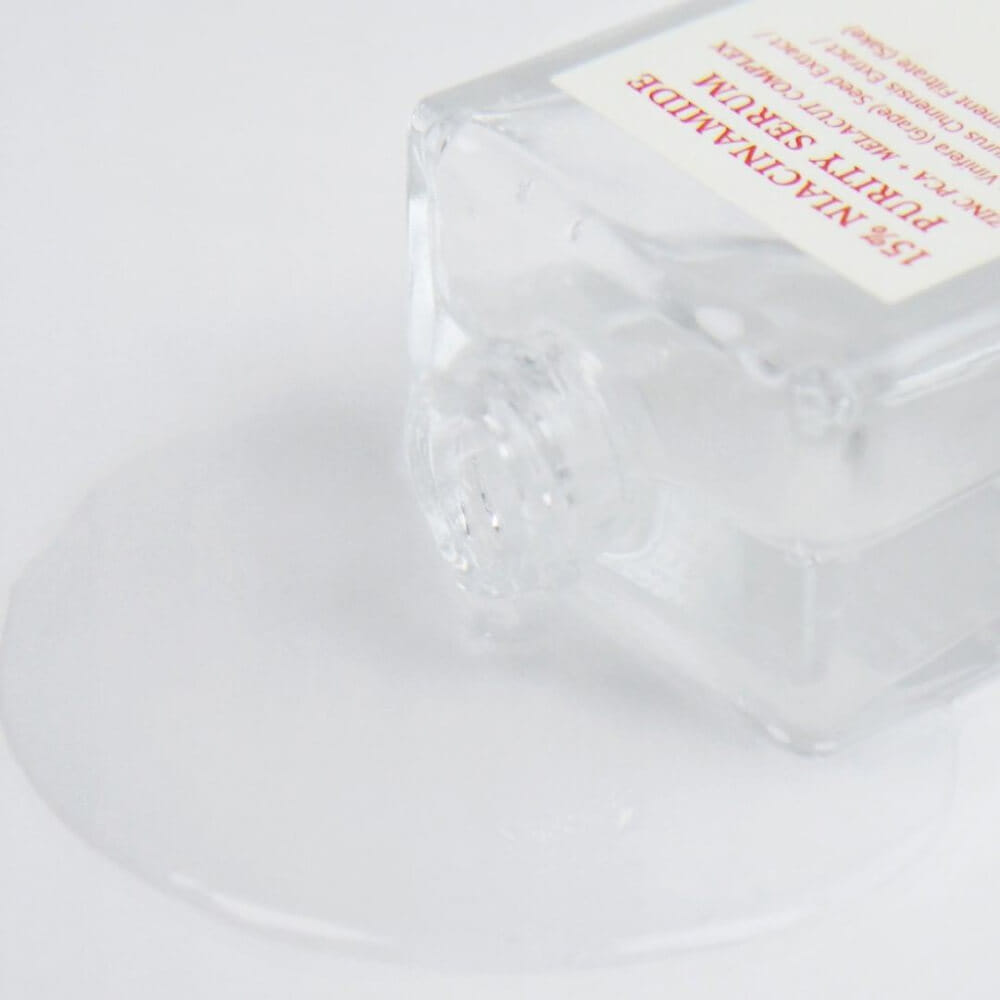 - 15% ниацинамида (витамин B3) нормализует жирность кожи, предотвращает воспаление, а также препятствует появлению пигментации и следов постакне. Стимулирует выработку коллагена и повышает упругость.