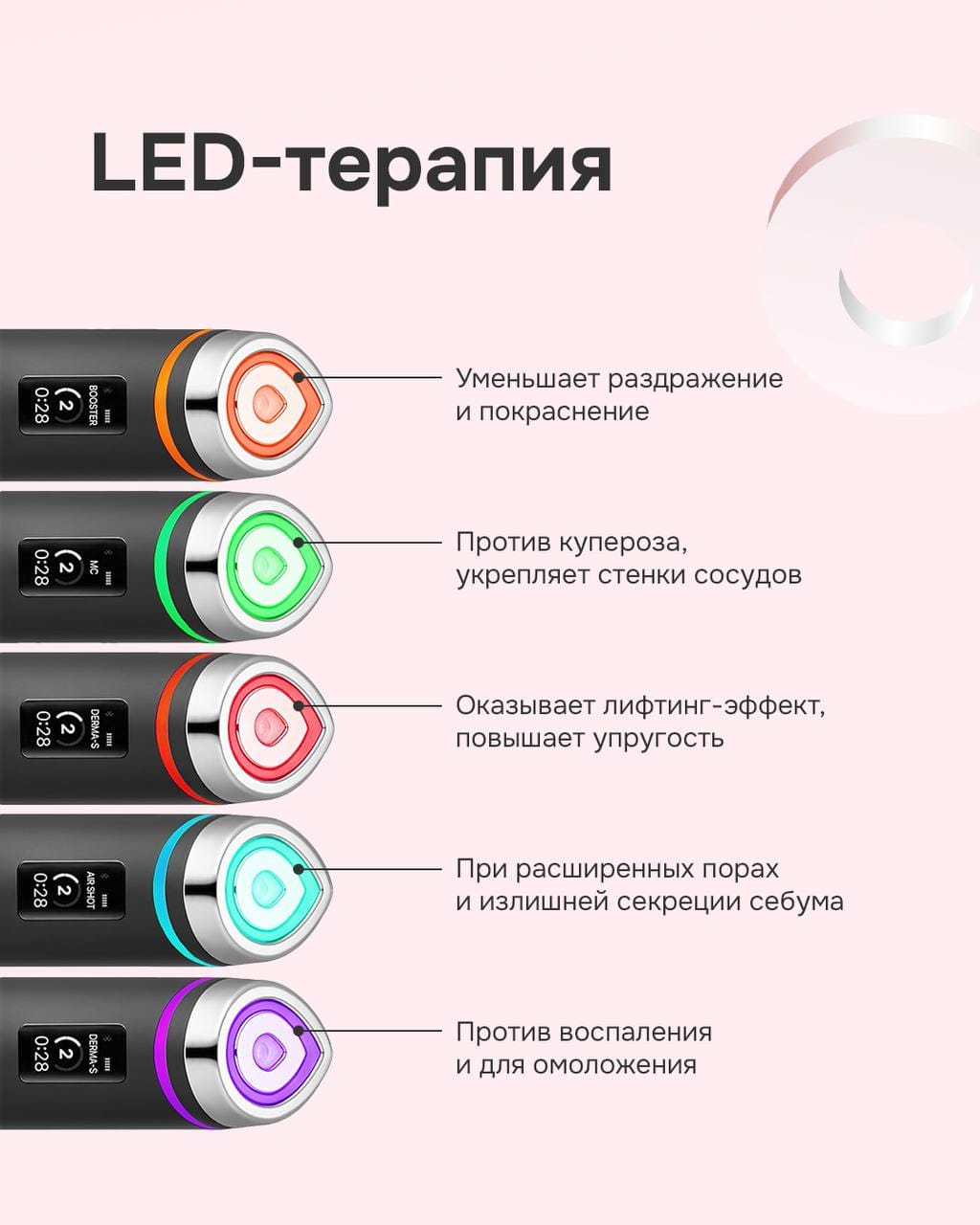 - основной LED-индикатор изменяет цвет в зависимости от режима, позволяя достичь таких эффектов, как сужение пор, осветление, повышение объема, укрепление и усиление абсорбции