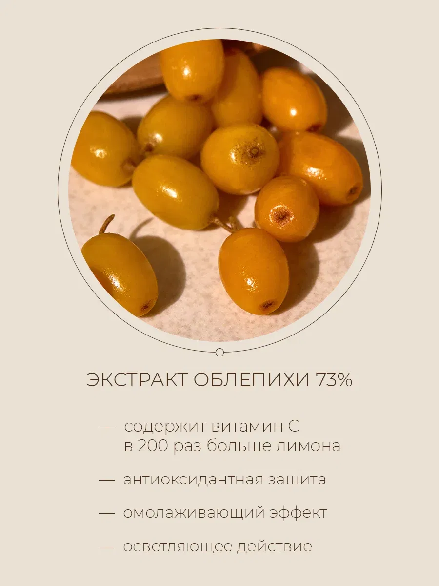 Формула основана на 73% экстракте облепихи и содержит масло облепихи (100 ppm) — эти компоненты отличаются высокой концентрацией витамина C. Экстракт облепихи деликатно осветляет пигментацию, тонизирует и защищает от оксидативного стресса.
