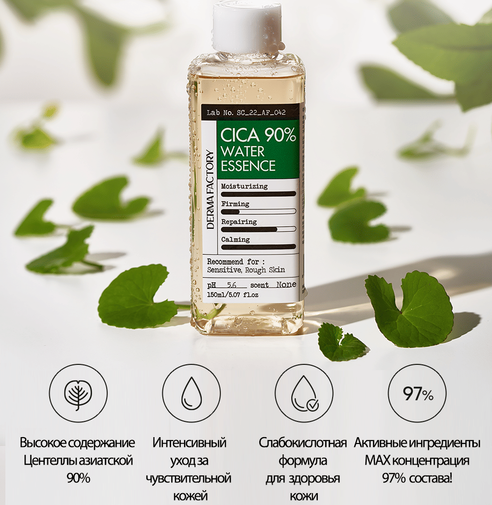 Тонер-эссенция успокаивающая с центеллой азиатской Derma Factory Cica 90 water essence 150мл