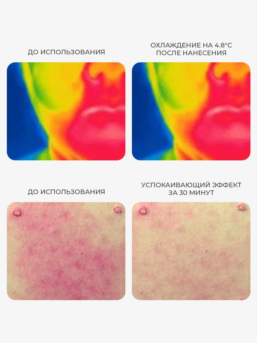 Охлаждающий крем с 5% пантенола для чувствительной кожи мгновенно снижает температуру кожи на 4.8°C, эффективно успокаивает красноту, раздражение и зуд всего за 30 минут, интенсивно насыщает влагой, укрепляет кожный барьер и препятствует обезвоженности, устраняет шелушения и смягчает.