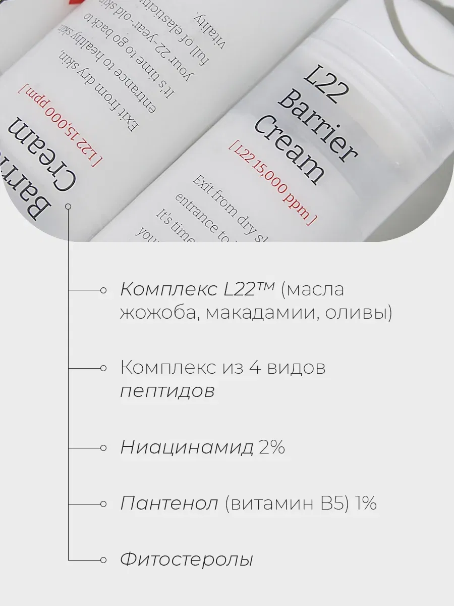 L22 Barrier Cream восстанавливает барьер и укрепляет защитные функции, нормализует гидролипидный баланс, борется с сухостью и шелушениями, устраняет красноту и зуд, интенсивно увлажняет и питает, оказывает смягчающее воздействие и повышает эластичность кожи.